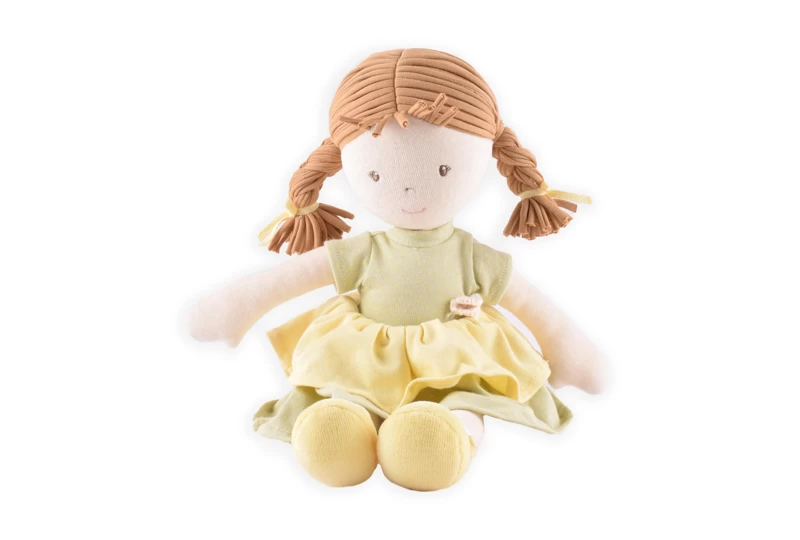 Bonikka Rag Doll – Honey with Light Brown Hair and Green Cotton Dress is a gorgeous soft rag doll, making her the perfect cuddle companion for littlies. Honey has light brown hair, swept up in a pair of cute piggy tail plaits that frame her peachy soft face. A stunning little lady in her crisp green cotton dress and yellow mary jane shoes, she is always ready for a cuddle or a tea party.Â