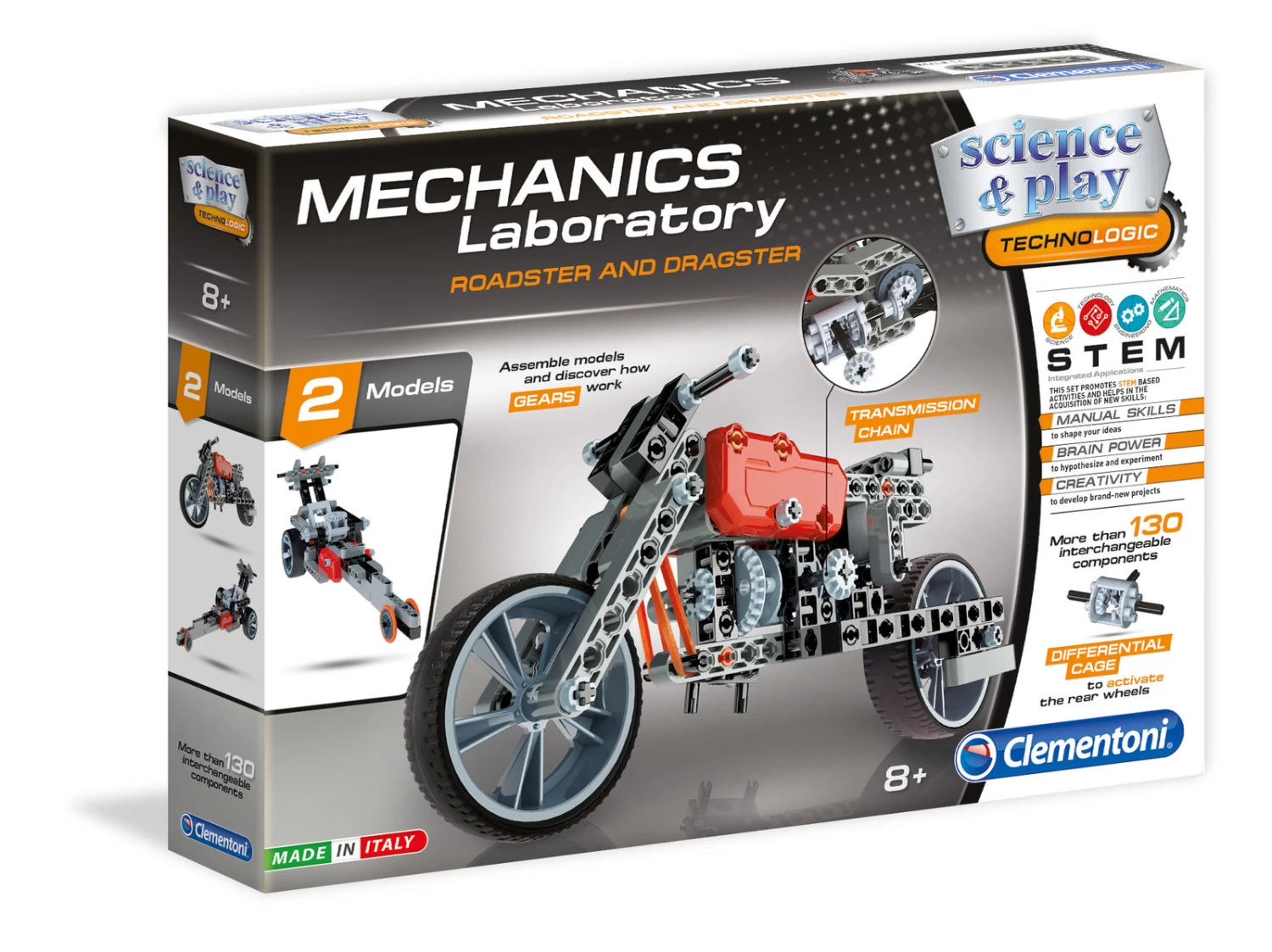 The Clementoni Mechanics Laboratory Roadster and Dragster is a scientific kit for discovering and experimenting with the mechanics of road vehicles. With 2 models and 130 interchangeable components to assemble, including: gearbox, gears, rims, tyres, elastics, bars, brushes, sheaves and pins. The illustrated manual will show your child how to assemble the models… for endless hours of fun!