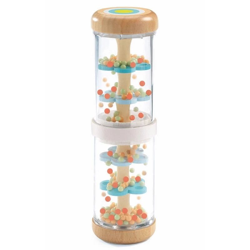 Djeco Baby Raini | Shaker / Rattle Toy is an adorable, pastel and natural wood coloured rain shaker that is designed to introduce babies to cause and effect. Babies will discover how moving the shaker results in the beads moving and making sound as they fall through the shaker.Â
