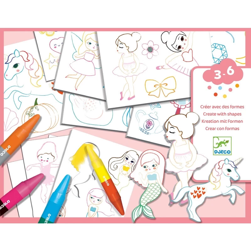 Djeco Create Shapes Girls is a simple creative activity for your child. Use the crayons provided to colour in and pop out the pretty designs on the 10 sheets provided. After removing the colourful picture from the sheet, it can be used in cards, in presentations, in animation or for whatever your childs heart desires.Â