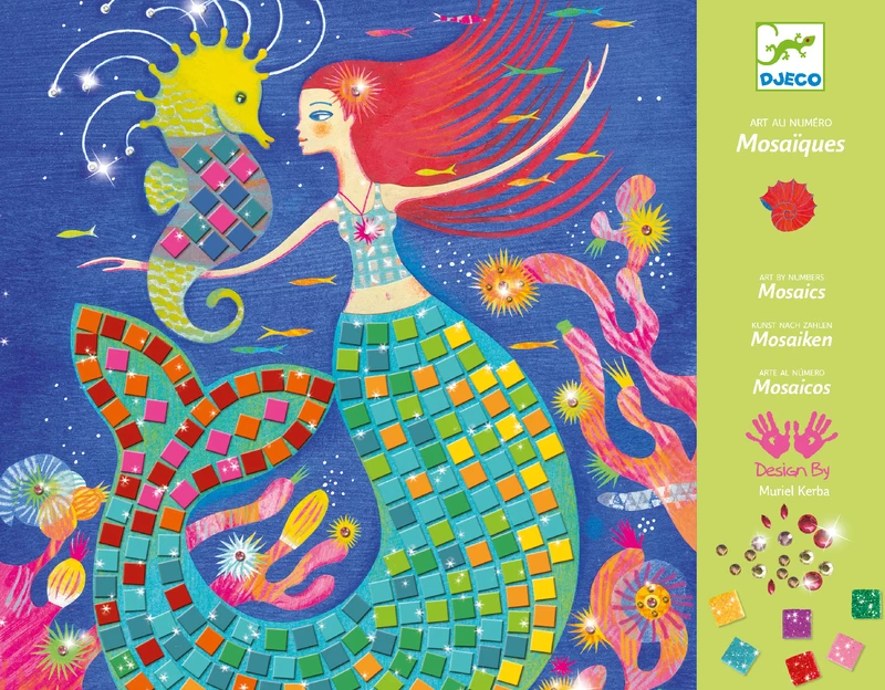 This gorgeous Mermaid themed Djeco Mermaid’s Song Mosaic activity set features 4 ocean scenes to decorate with pre-cut mosaic shapes. The set contains 4 pictures to complete, 16 sheets of metallic foam stickers, 4 sheets of rhinestones and full instructions.