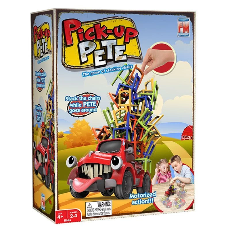 Have family fun with Pick-Up Pete, the game of stacking chairs. The object of the game is to pile as many chairs as you can into the back of the pickup as it goes around. If they fall, you’re out! Pete is programmed to go around in a circle so it’s perfect for tabletop fun.