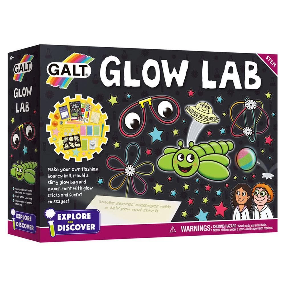 Explore the wonders of glow in the dark and discover how and why things light up with the Galt Glow Lab science kit. Experiment with glow sticks, make your own flashing glow bouncy ball and mould a slimy glow bug. Make fun glow glasses and reveal messages written in invisible ink! Includes 11 experiments for hours of glow science fun!