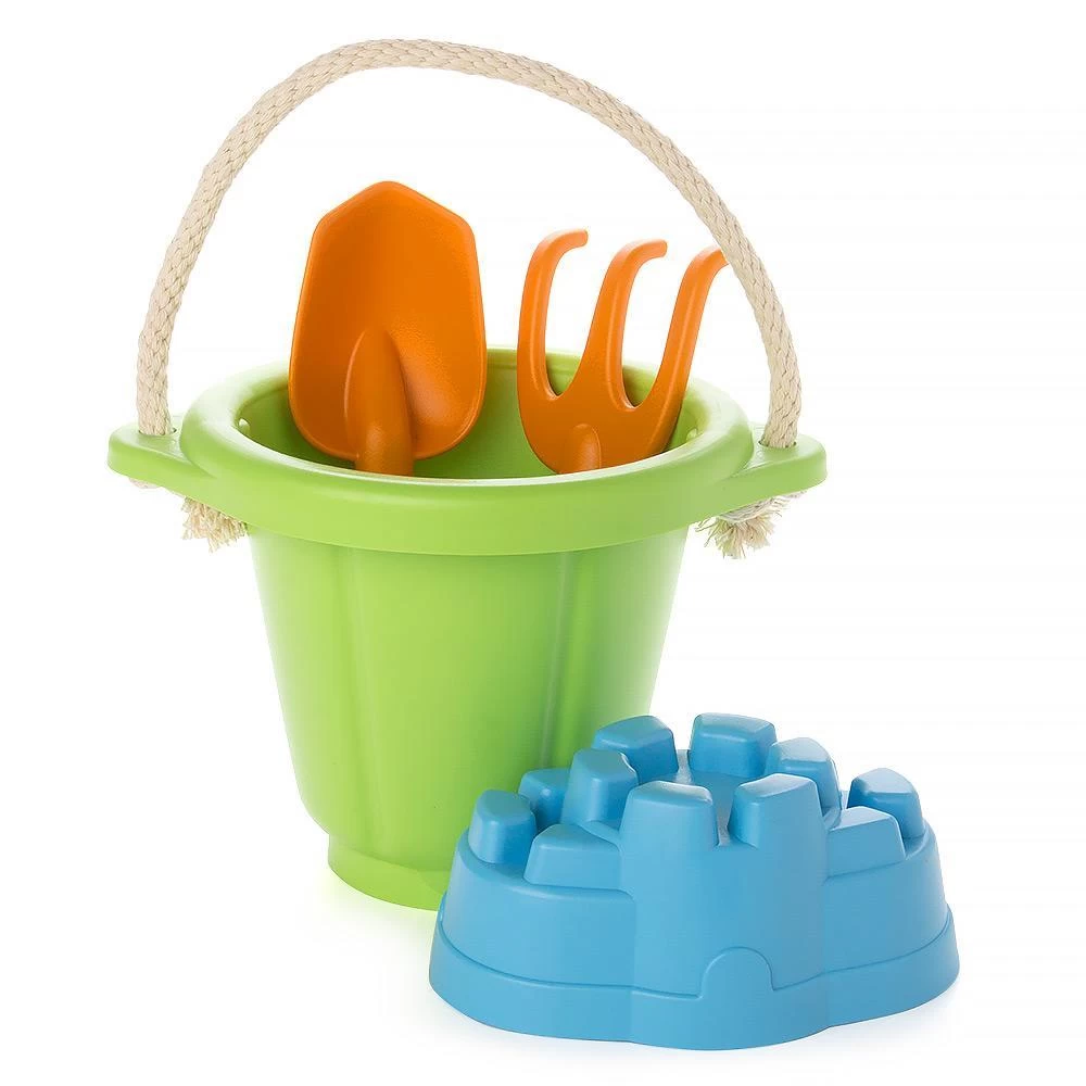 Build a sandcastle. Dig for buried treasure. Create crazy sand patterns with the rake. Whatever the project, the world’s most eco-groovy sand play set always leaves a light footprint. This fabulous Green Toys Sand Play Set is made from 100% recycled plastic and can be carried to the park or beach with the sturdy 100% cotton rope. This 4-piece Sand Play bucket & spade beach set comes with a super sturdy green bucket, shovel, rake, and sand castle mold. Perfect for a day at the beach or in your backyard sandpit.