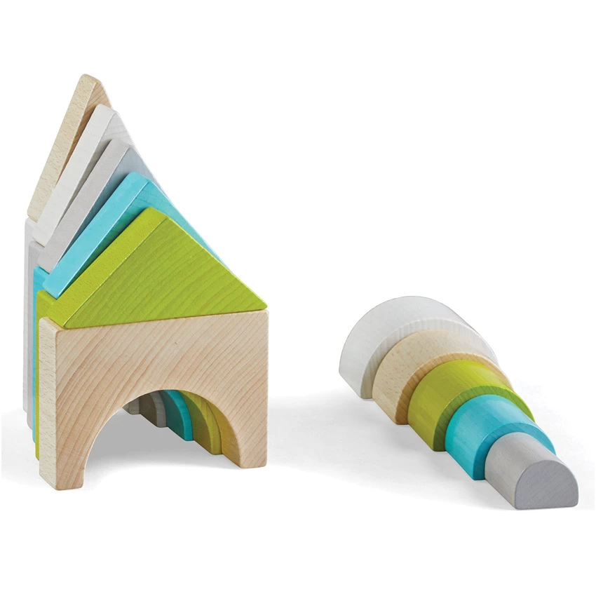 Block upon block, higher and higher. Who can build the most spectacular skyline of towers? Junior architects construct dreamlike townscapes from wooden blocks of different sizes and shapes in harmonious colors of natural timber tones and hues of grey, green and blue. Made in Germany from PEFC certified sustainable eco-friendly beech wood, these blocks allow kids to develop fine motor skills and hand-eye coordination. With countless creative design options, the 15 blocks have smooth edges which are tactile for little hands allowing open ended play which is always different and fascinating every time.