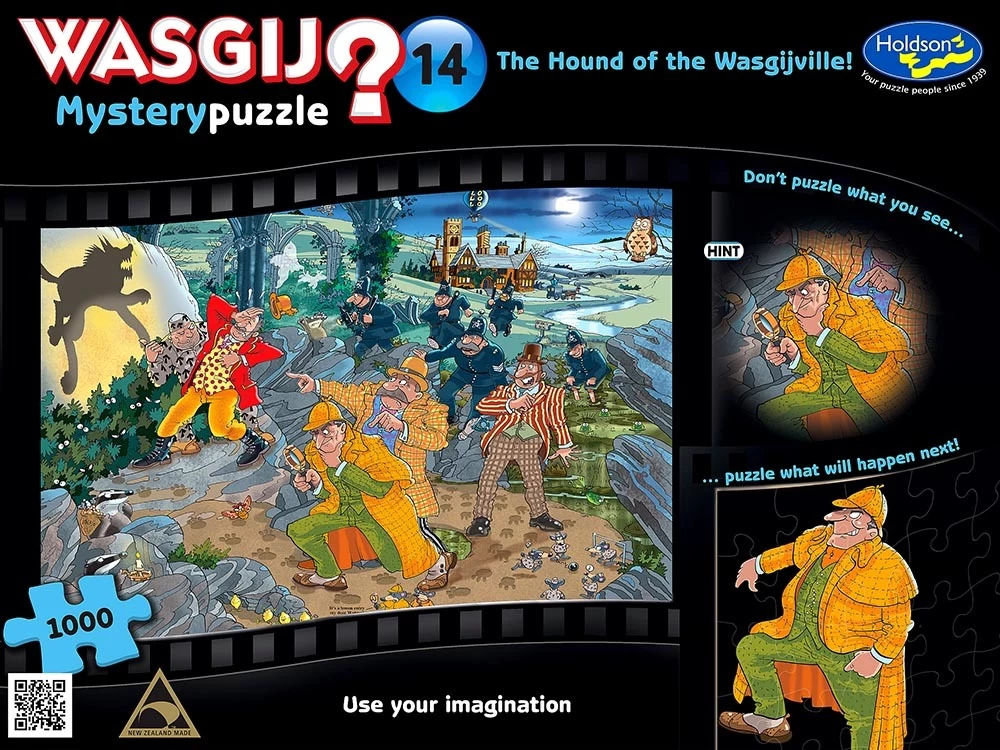 Holdson WASGIJ? Mystery #14 | The Hound of The Wasgijville! 1000pc Jigsaw Puzzle is a humorous take on usual puzzling! Wasgij – is jigsaw spelt backwards and is pronounced ‘Woz-gidge’. It is a brainteaser style puzzle requiring puzzlers to use their imagination and a few clues provided, to put themselves in the position of a particular character – in this case Detective Sheer-Luck. Once the puzzler has done this, they need to imagine what that character is looking at in front of them – THAT is the image they must piece together.Â