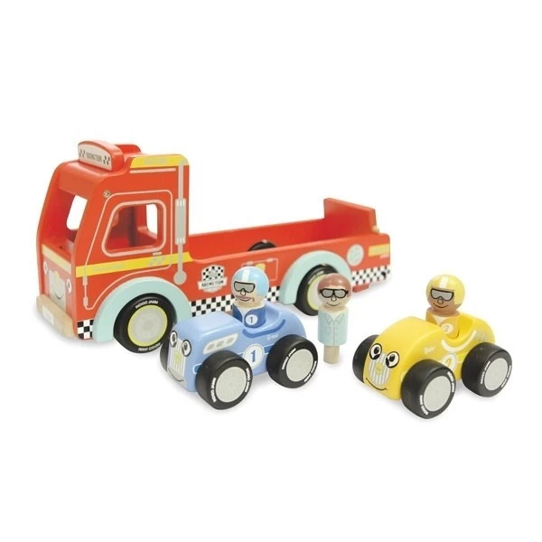 Let’s hit the track! A wooden car transporter with movable rear loading ramp. Carries 2 wooden sports cars and their removable drivers. Removable roof provides easy access to the driver.