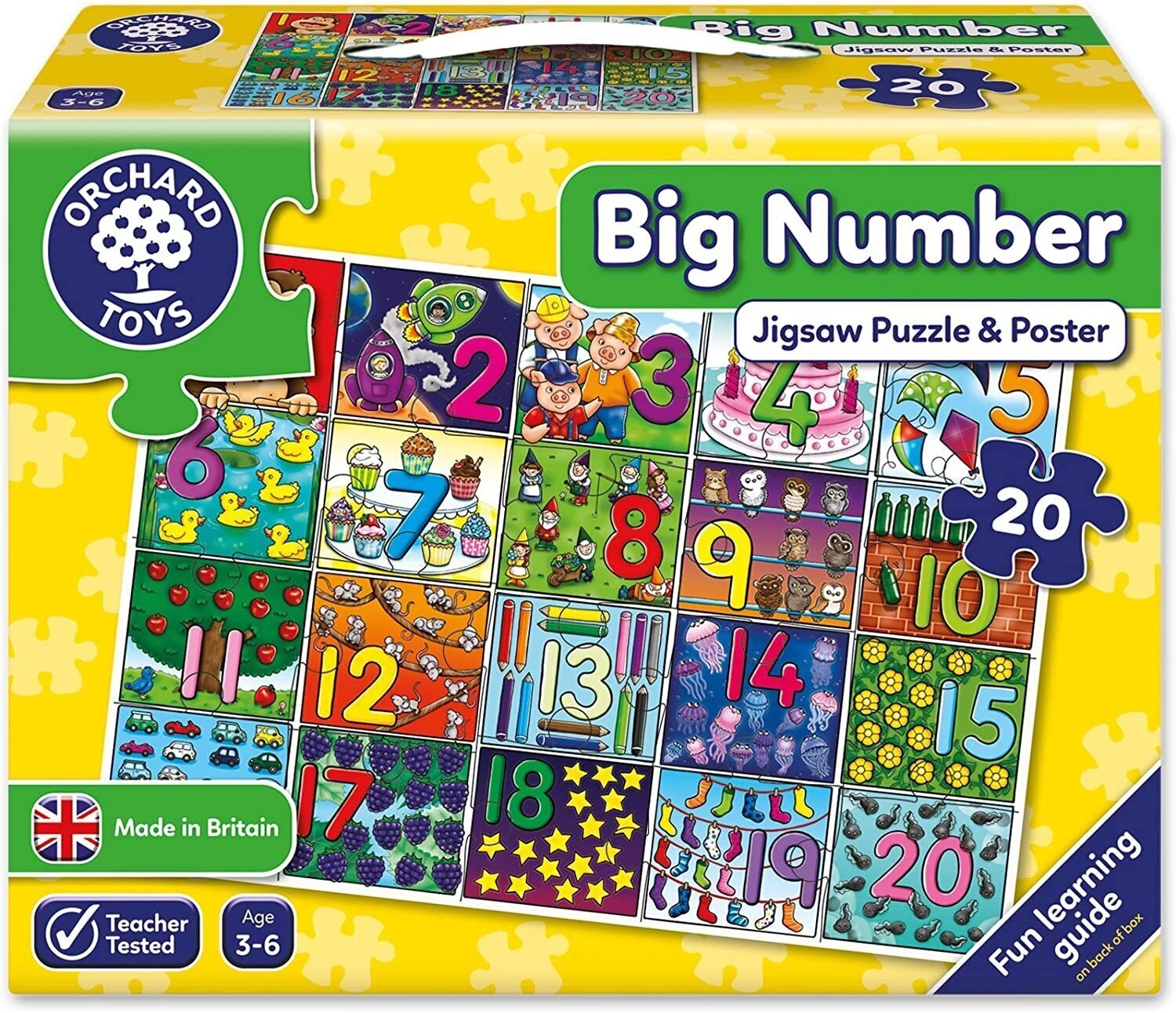 Big Number Jigsaw Puzzle! This bright and colourful 20pc chunky wipe-clean jigsaw puzzle by Orchard Toys encourages number recognition and counting skills from 1-20. It is full of characters and objects to observe and talk about as you and your little one complete the puzzle. This fun jigsaw puzzle is suitable to play on the floor or on a table! Designed to encourage number recognition and counting skills as well as observational skills and spontaneous dialogue, the puzzle has a learning guide on the box that provides questions to ask your little one e.g. How many mice can you see? Can you find the number 9 on the puzzle? Also included is a full size poster of the jigsaw for use as a learning guide. A fun and engaging learning activity for your child or class.Â