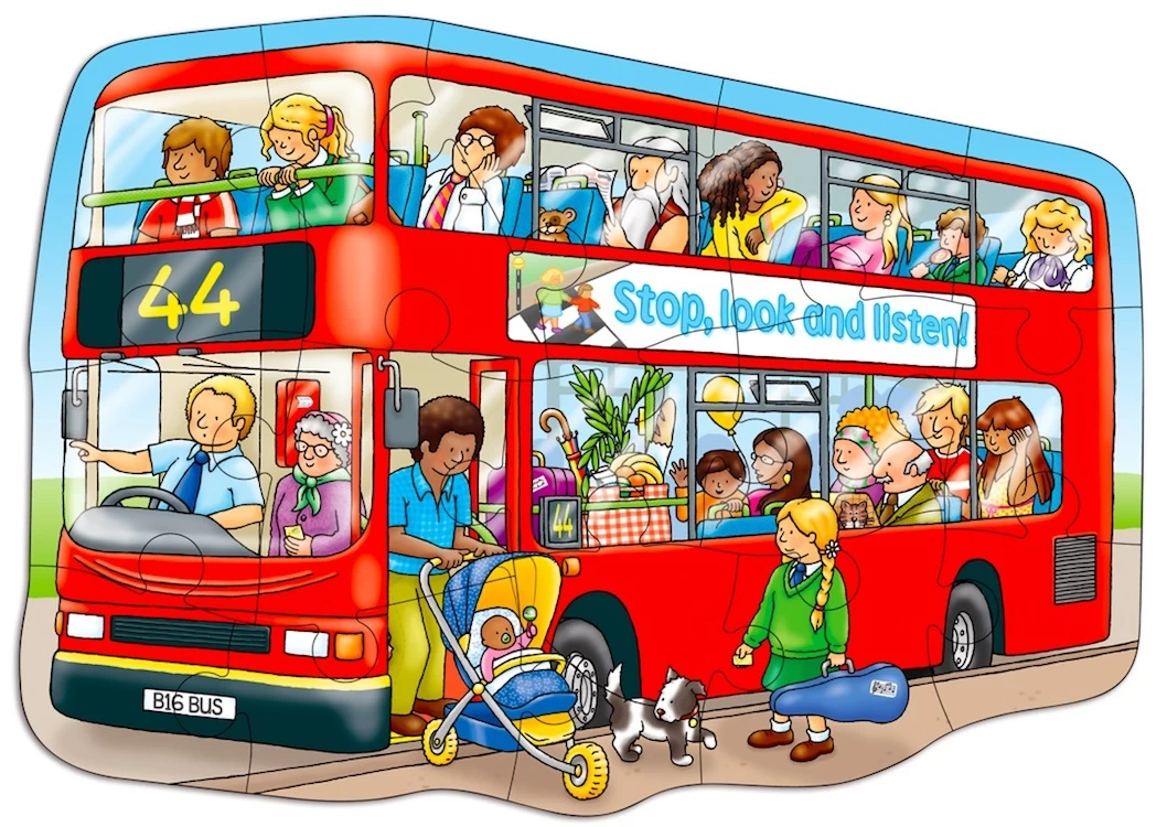 All aboard the Big Red Bus! This bright and colourful 15pc floor jigsaw puzzle by Orchard Toys has lots of interesting passengers to observe and talk about as your little one completes the puzzle, which encourages observational skills and spontaneous dialogue. With chunky wipe clean pieces and a learning guide on the box, you have everything you need for a fun learning activity with your child or class.Â