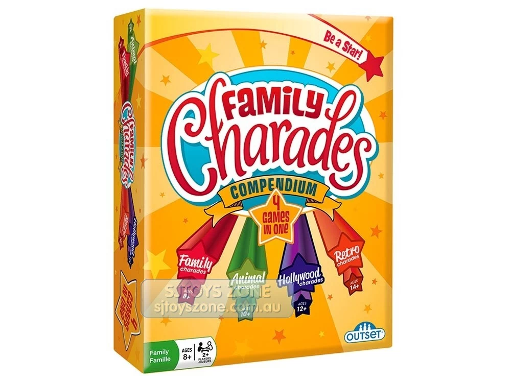 Family Charades Compendium includes 4 different charades games. Beginning with Family Charades (ages 8+), this game makes playing charades easy. Other categories include Animal Charades (ages 10+), Hollywood Charades (ages 12+) and Retro Charades (ages 14+).