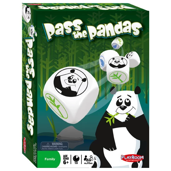 Loved by kids and adults alike, Pass The Pandas is the fast and fun dice game that creates panda-monium for the whole family.  Be the first to get rid of all of your dice in Pass the Pandasâ„¢ by rolling pandas, bamboo or water drops.  Pandas can be passed to other players, water drops evaporate and are discarded, and bamboo can be given to other players if they can’t match your bamboo roll, but you’ll have to take bamboo from previous players if you can’t match their rolls!  Will you be the first to pass all your pandas and get rid of all your dice?Â