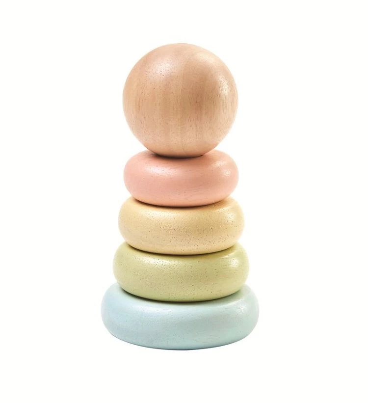 PlanToys First Stacking Ring | Pastel is a stacking ring that is super easy on the eye! With the softest of soft pastel dyes, over natural coloured rubber wood, this early learning toy is bound to delight. Stack the rings in any order to create a variety of patterns, or stack in size order while developing important fine motor skills. Smooth to the touch and gentle on the eye, this stacking toy with its bendable rod for safety is bound to be a winner when given as a gift. Be sure to check out our other pastel plan toys to put together an unforgettable gender neutral new baby or baby shower gift.
