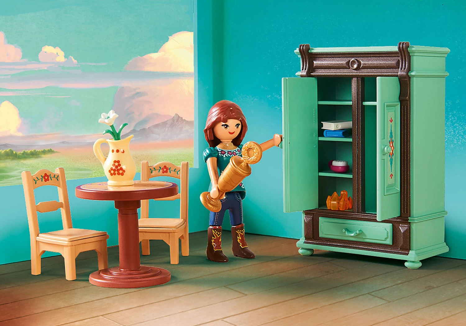 This Playmobil Spirit Riding Free set has a set of furniture for Lucky’s cosy room in her new countryside home. Kids who love the Spirit movie and their horse toys, will adore this beautiful play toy set, that will encourage hours of imaginative play. Included is Lucky’s bed, wardrobe, a vanity table with chair, a treasure chest full of ‘treasure’ and other exciting accessories for hours of imaginative play!