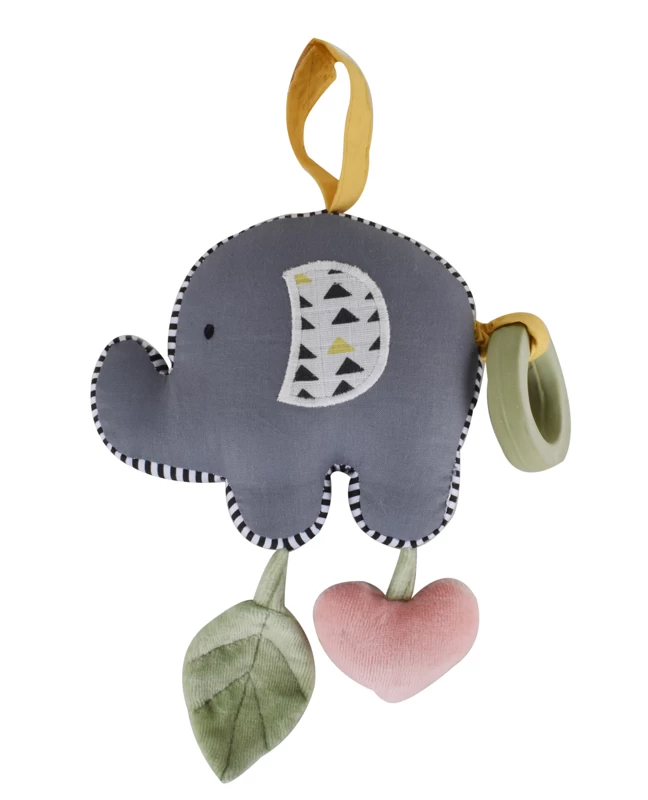 This sweet Tikiri Elephant Pram Toy features a loop to attach to the pram and a natural rubber ring for teething. Made from 100% organic cotton & rubber this pram activity toy is bound to become a baby favourite for on the go, both as a toy and to comfort your teething baby. Filled with fun features to stimulate your baby, this Tikiri Elephant has a soft plush body, soothing vibrations when baby pulls the teether ring on the elephants tail, a crinkly leaf for sensory development, a squeaker inside the hanging heart and it’s all made from ethically sourced soft natural rubber and organic cotton. This enchanting little elephant is sure to become one of baby’s favourites!