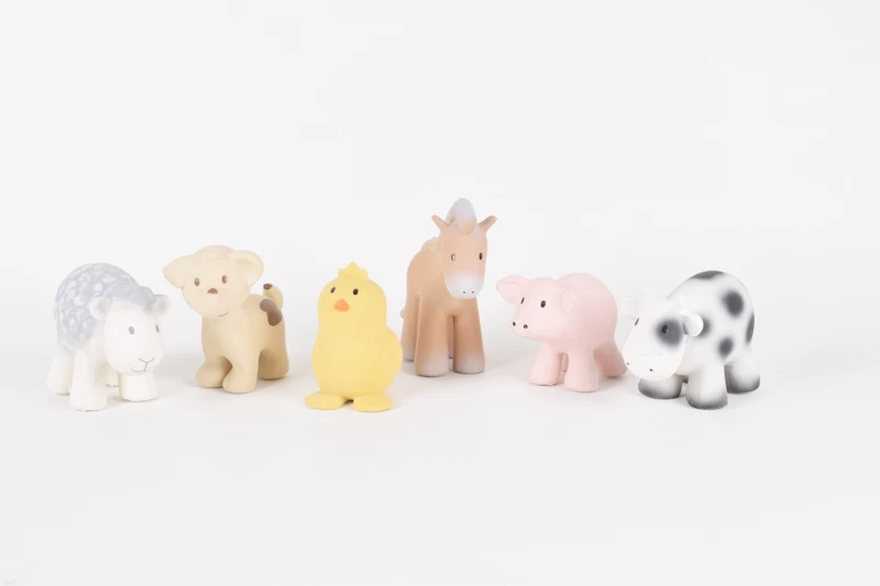 This gorgeous range of Tikiri’s My First Farm Animals includes all 6 of our fave natural rubber farm animal baby teethers. This full set of 6 includes 1 of each Sheep, Pig, Chicken, Horse, Cow and Dog. These sustainable natural rubber toys are great for young babies to soothe teething gums.