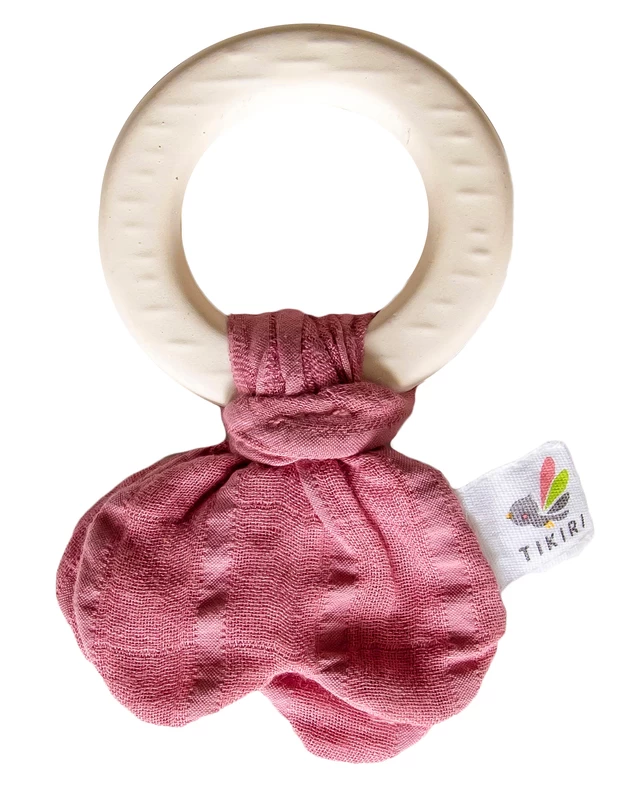 A stunning natural rubber teething ring with a gorgeous dusty pink 100% cotton muslin fabric tie. Perfect for little hands and mouths to explore.Â